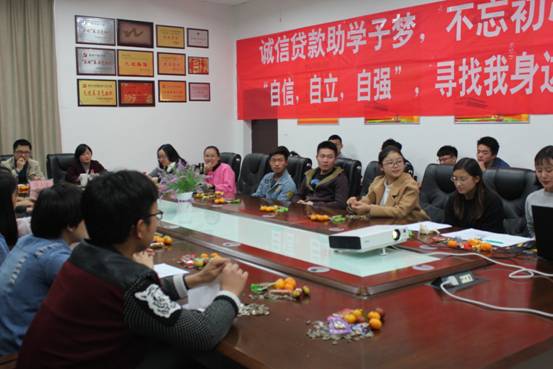 座谈会在学生们绘声绘色的自我介绍中拉开帷幕。紧接着就是以 “诚信感恩”为主题的讲解分析。同学们以自己准备的材料为蓝本畅所欲言、各抒己见。分别以诚信贷款为主线,牵引出自身经历和感受并作出承诺,将诚信感恩、自立自强精神展现得淋漓尽致。其中以王长会同学表现尤为突出,切合自身情况分享贷款前后的经历使活动氛围得以高涨。而后,同学们就大学生诚信贷款的相关疑问向陈大业老师提出问题,陈大业老师逐一给予解答并做最后的总结,指出我们首先应该懂得感恩自己,因为唯有懂得感恩自己才能感恩他人,感恩社会。最后,座谈会在全体成员合影留念中圆满结束。