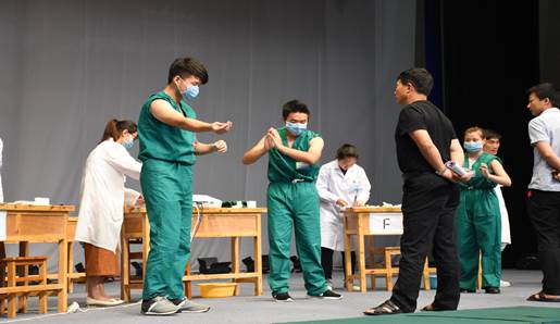 此次比赛共7支参赛队伍,分别参与了方剂知识背诵、骨科影像诊断、骨科体格检查、外科术前准备技能操作、夹板和石膏固定等5环节的理论分析和技能操作大比拼,在比赛过程中直观展示洗衣、穿衣、缝合、打结等骨伤基本技能操作,赛出风格,赛出水平。